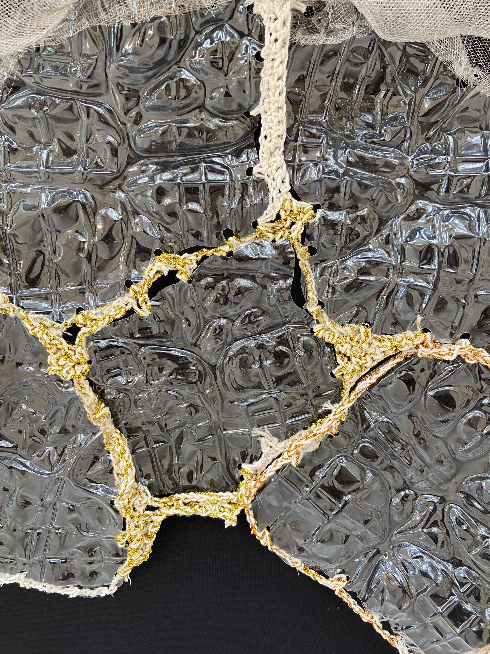 The reflective shimmer of the plastic, juxtaposed with the dark matter dangling in between, creates an evocative interplay of light, shadow, movement and texture engaging the viewer in a constantly shifting visual dialogue and into a realm where unexpected beauty emerges from dis-carded materials, challenging traditional perceptions of worth and waste. Misfit celebrates the transformative power of creativity and the resilience found in the unconventional.