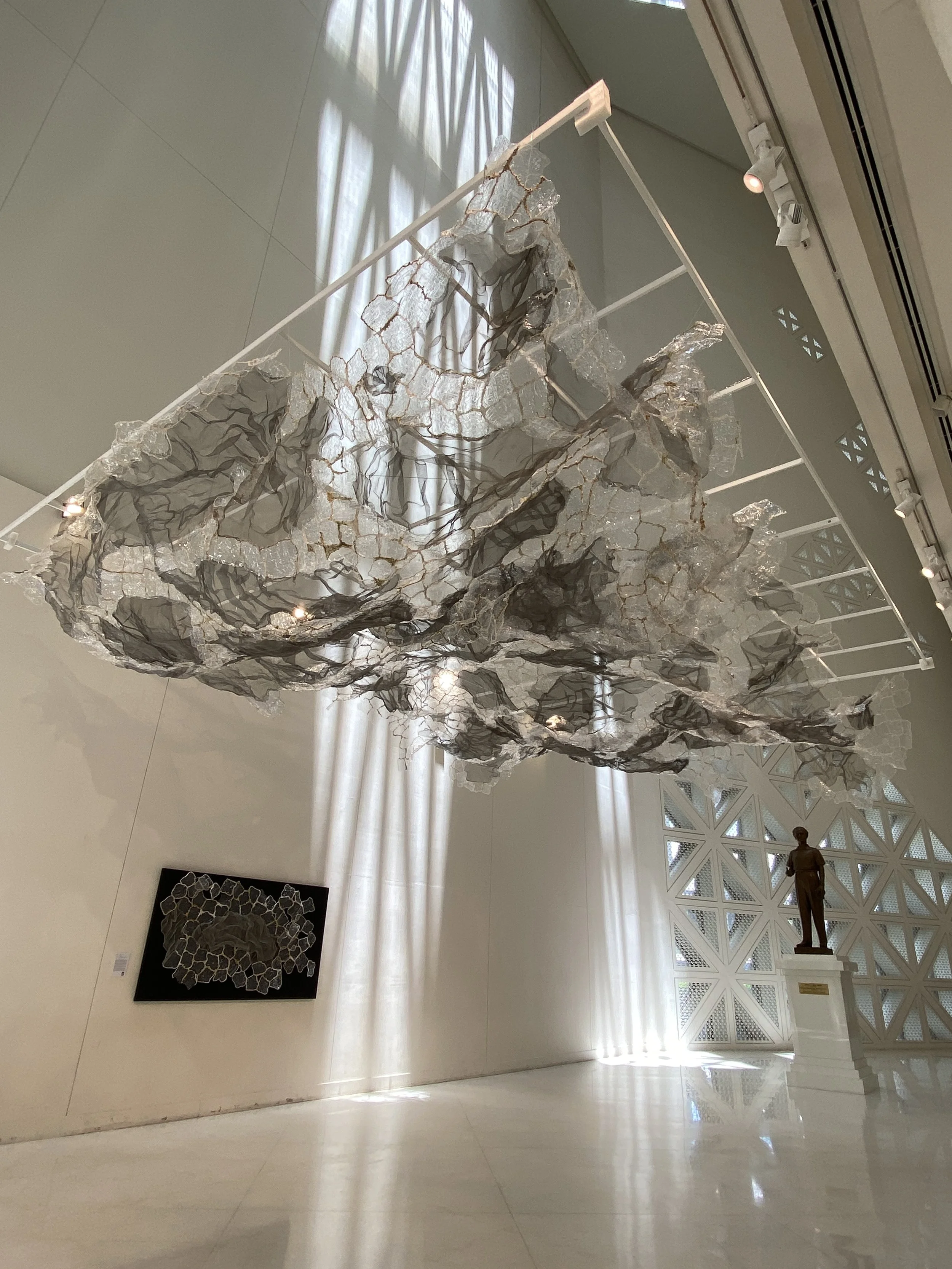 Ploenchan Vinyaratn's "Rippling Veil" invites viewers to step into an ethereal underwater world, where the boundaries between air and water blur into a mesmerizing dance of light and texture. This large mixed-media textile installation, crafted entirely from upcycled materials, immerses the audience in a unique visual experience reminiscent of looking up to the water's surface from below.
