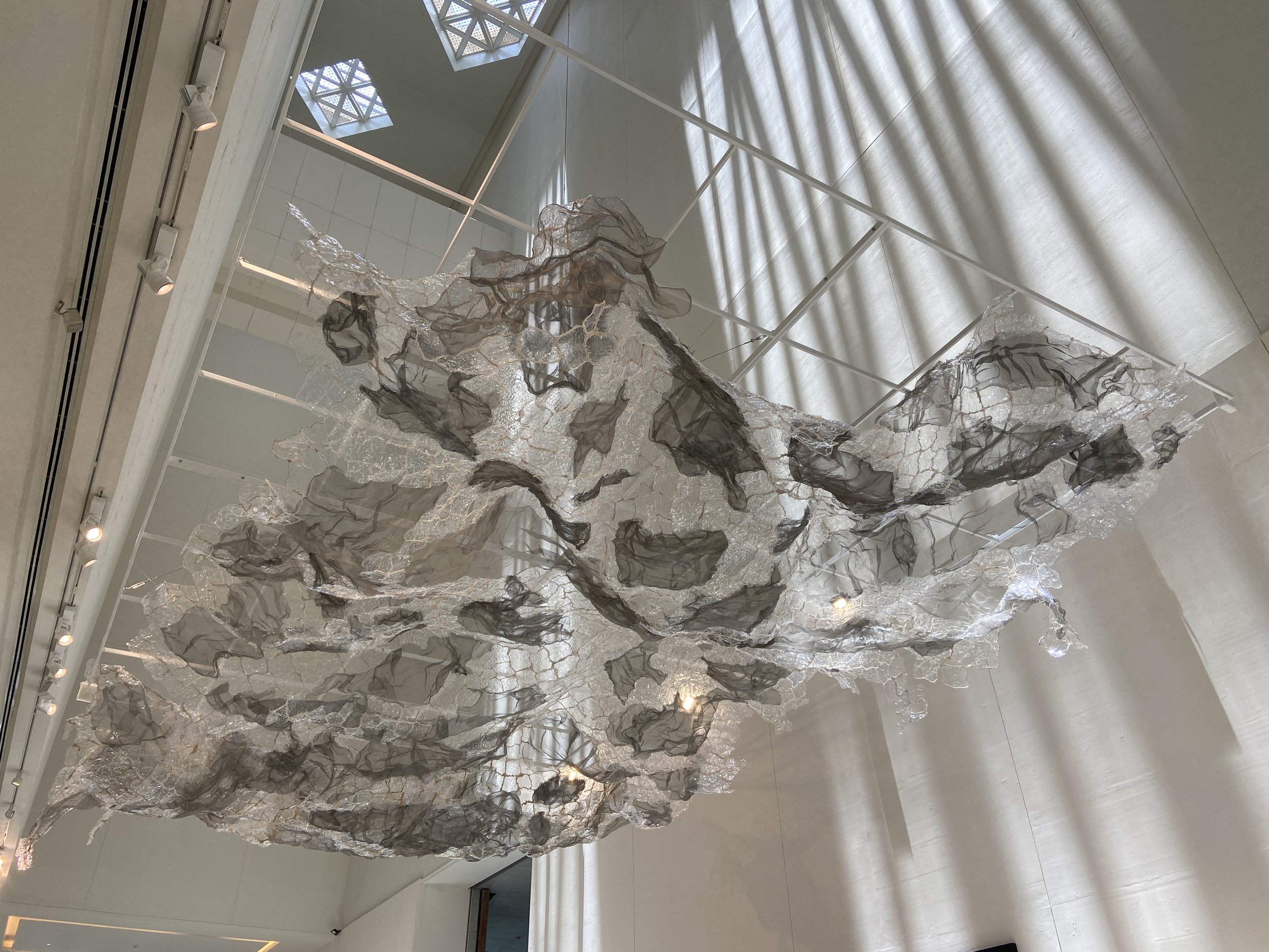 Suspended above the viewer, this intricate mosaic of shimmering plastic, leftover yarns, and recycled mesh screens creates a dynamic, ever-changing canopy. The interplay of light through the various textures casts rippling patterns across the space, simulating the dappled sunlight that filters through water. The dark mesh evokes smoke and exhaust, adding a layer of complexity as it undulates and moves within an atmosphere physically influenced by the viewers themselves.