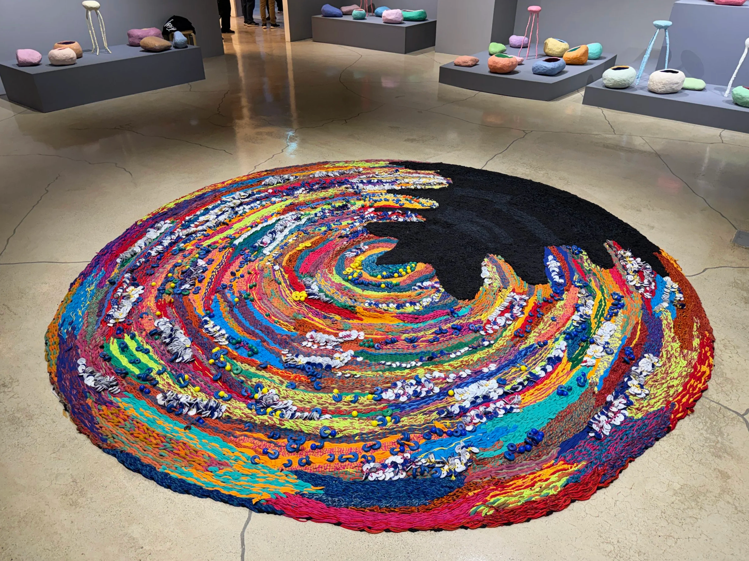 Selected for the Cheongju International Craft Biennale, Afterfract transforms personal rupture into universal visual language. Its title—a neologism fusing “artifact” and “after fracture”—casts the work as archaeological evidence of an ending. A floor-based installation centred on a deliberate void of black yarn shifts in scale depending on viewer perspective. Rather than promising repair, Afterfract confronts absence while transforming disputed yarn and recycled aluminium into a monumental contemplative form, exemplifying Mook’s practice of turning remnants into meaning.